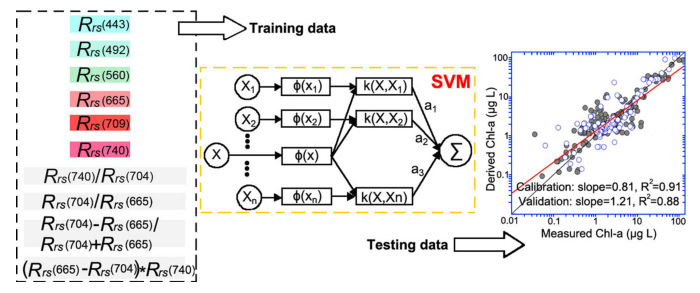 目前,叶绿素a定量遥感研究多集中于分析算法、经验算法和半分析算法,虽然在一些湖泊案例应用取得较好的反演精度,但这些算法易受到区域背景环境条件和大气组成成分影响。随着人工智能—机器学习算法的发展,开辟叶绿素a定量遥感技术的新思路。因此,中科院长春净月潭遥感实验站宋开山研究员及其研究团队在2017-2019年采集中国典型45个湖泊的水体样品,共计获取273个实测叶绿素a浓度值,基于哨兵2号卫星反射率数据(Sentinel-2 A/B MSI)和叶绿素a敏感波段组合数据集,借助机器学习算法,训练和验证叶绿素a反演模型,取得较高的反演精度。研究结果表明,线性回归(LR)、支持向量机(SVM)和Catboost机器算法均获取比传统叶绿素a经验算法较高的反演精度。其中,SVM获取更稳健的模型反演效果(训练和验证结果:R2>0.88),并在低悬浮物浓度、高DOC浓度的湖泊水体中反演效果更佳。此外,研究结果还表明机器学习算法在中国大尺度湖泊叶绿素a定量遥感研究中具有应用潜力,为中国湖泊叶绿素a定量遥感和富营养化监测提供技术支撑。