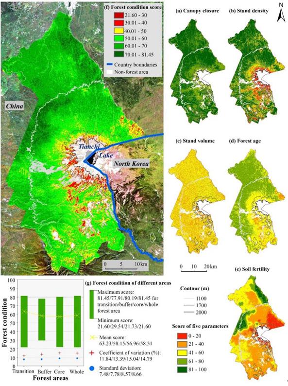 中科院东北地理所地理景观遥感学科组研究人员选取林龄、郁闭度、立木密度、蓄积量和土壤肥力等重要生态参数作为评价指标,基于ALOS-2L波段雷达数据、Sentinel系列卫星的C波段雷达和可见光影像、ALOSDSM数据和大量的野外调查数据,开展了长白山森林结构和功能参数的遥感反演研究,并将其应用于森林健康状况评价。该研究系统分析了遥感因子与各参数的关系,并通过统计回归、随机森林、随机森林克里金等空间建模方法,反演获得长白山国家自然保护区林龄、郁闭度、立木密度、蓄积量和土壤肥力等参数的空间分布;在此基础上,利用主成分分析法确定各参数权重,构建了长白山国家自然保护区森林健康状况评价模型,并对评价结果进行了不确定性分析。