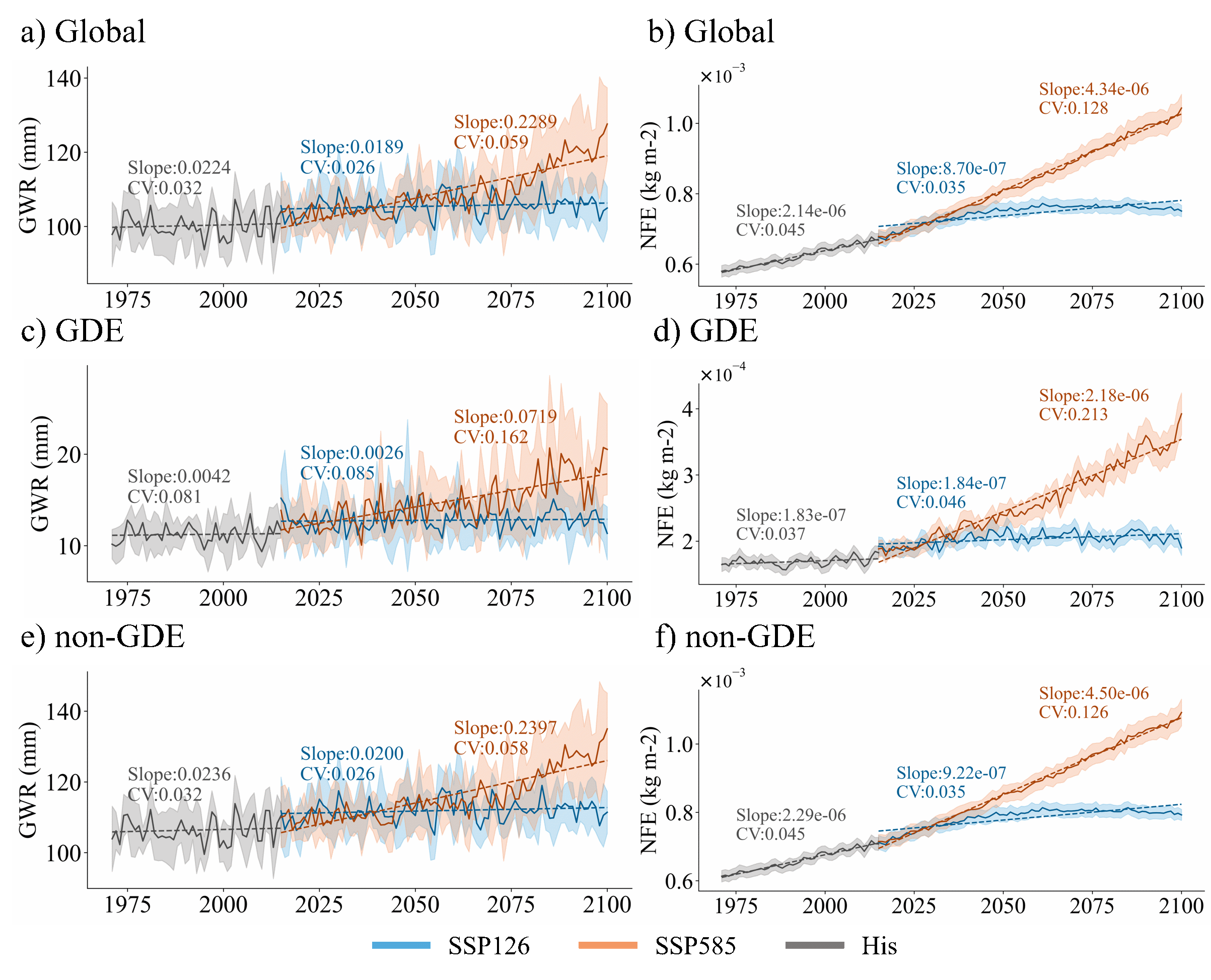 图1 在两种气候情景(SSP126和SSP585)下,全球自然生态系统、GDEs和Non-GDEs在历史时期(1970-2015年)和未来时期(2015-2100年)地下水补给和固氮效率的年际变化。a、c、e 分别代表全球、GDEs和Non-GDEs的地下水补给年均趋势。b、d、f 对应于固氮效率。斜率表示拟合曲线的斜率,反映总体变化趋势。CV 表示变异系数,反映时间波动。