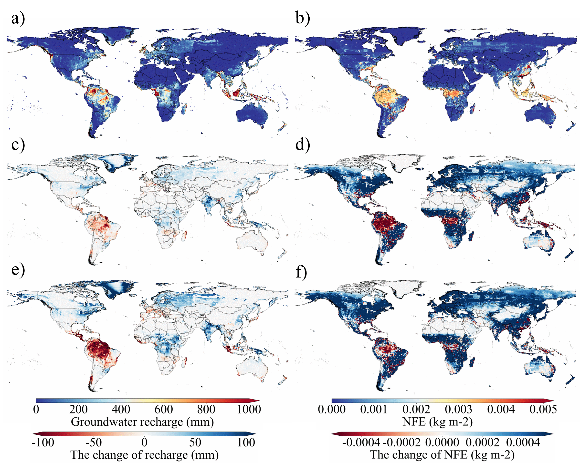 图2 自然生态系统中历史时期,以及SSP126和SSP585情景下相对于历史时期地下水补给和固氮效率的绝对变化的空间分布格局。a代表历史时期地下水补给的空间分布。c和e表示在SSP126和SSP585情景下地下水补给相对于历史时期的绝对变化的空间格局。b代表历史时期固氮效率的空间分布。d和f表示在SSP126和SSP585情景下固氮效率相对于历史时期的绝对变化的空间格局。