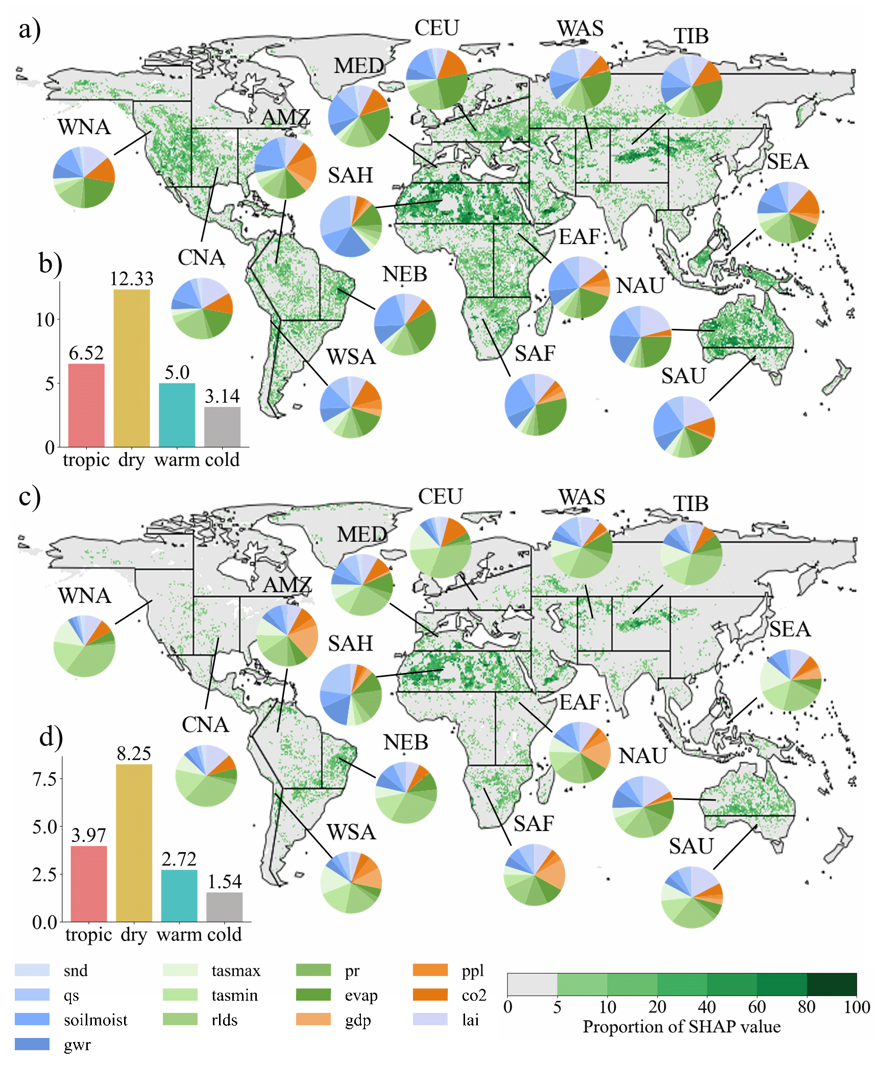 图3 不同情景下地下水补给SHAP值百分比的空间分布,包括各子区域中各因素SHAP值的比例。a和c代表SSP126和SSP585情景下全球格局下地下水补给的SHAP值比例,以及各子区域中各因素的比例。b、d图显示了SSP126和SSP585情景下不同气候带中地下水补给的SHAP值比例。