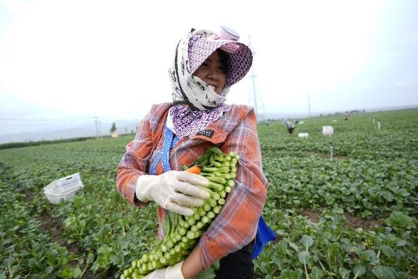 工作人员在宁夏固原市原州区彭堡镇采摘菜心。新华社记者王鹏摄