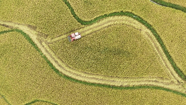 农机手驾驶联合收割机在贵州省绥阳县旺草镇收割水稻(无人机照片)。新华社发(李前勇摄)