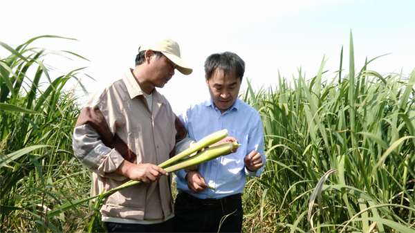 丁炜(左)与文波龙(右)探讨茭白品种
