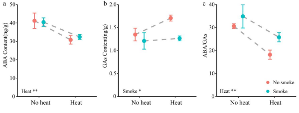 近期,盐碱地资源与利用学科组的研究人员以盐生植物碱蓬种子为研究对象,探究了烟雾、热激及其交互作用对碱蓬种子萌发的影响。结果发现:无论是热激还是烟雾,信号强度(如温度、时间)对碱蓬种子萌发具有显著影响,在碱蓬休眠解除过程中,信号强度比信号间的相互作用更为关键;与预期不同,热激和烟雾两种信号的组合处理,并未对种子萌发产生显著的协同促进效应(图1)。对内源激素测定结果表明,热激显著降低了种子种脱落酸(ABA)水平及其与赤霉素(GAs)的比值,表明热激可以通过调控内源激素的平衡,从而有效解除了碱蓬种子的生理休眠(图2)。本研究推动了对火信号解除种子休眠机制的理解,该研究首次从内源激素调控角度,提出并证实了热激解除生理休眠的一种新机制,为火后生境下碱蓬等盐生植物种群的更新和恢复提供了新的理论依据。