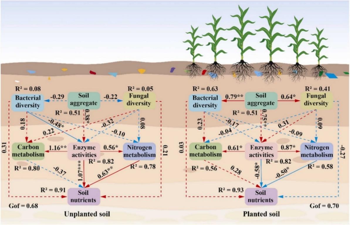 此外,研究人员比较了有无玉米种植条件下可降解聚乳酸微塑料(PLA MPs)对农田土壤生态过程的扰动效应。结果发现,PLA MPs显著影响土壤碳氮养分供给格局、土壤团聚体组成及微生物功能过程,但其生态效应在不同种植条件下表现出明显差异。在无植物条件下,PLA MPs整体上促进了土壤微生物碳氮代谢;而在玉米种植条件下,这种促进效应明显减弱,部分指标甚至呈现相反变化。进一步分析表明,作物根际过程以及植物与微生物之间的养分竞争,是调控PLA MPs生态效应的重要机制。