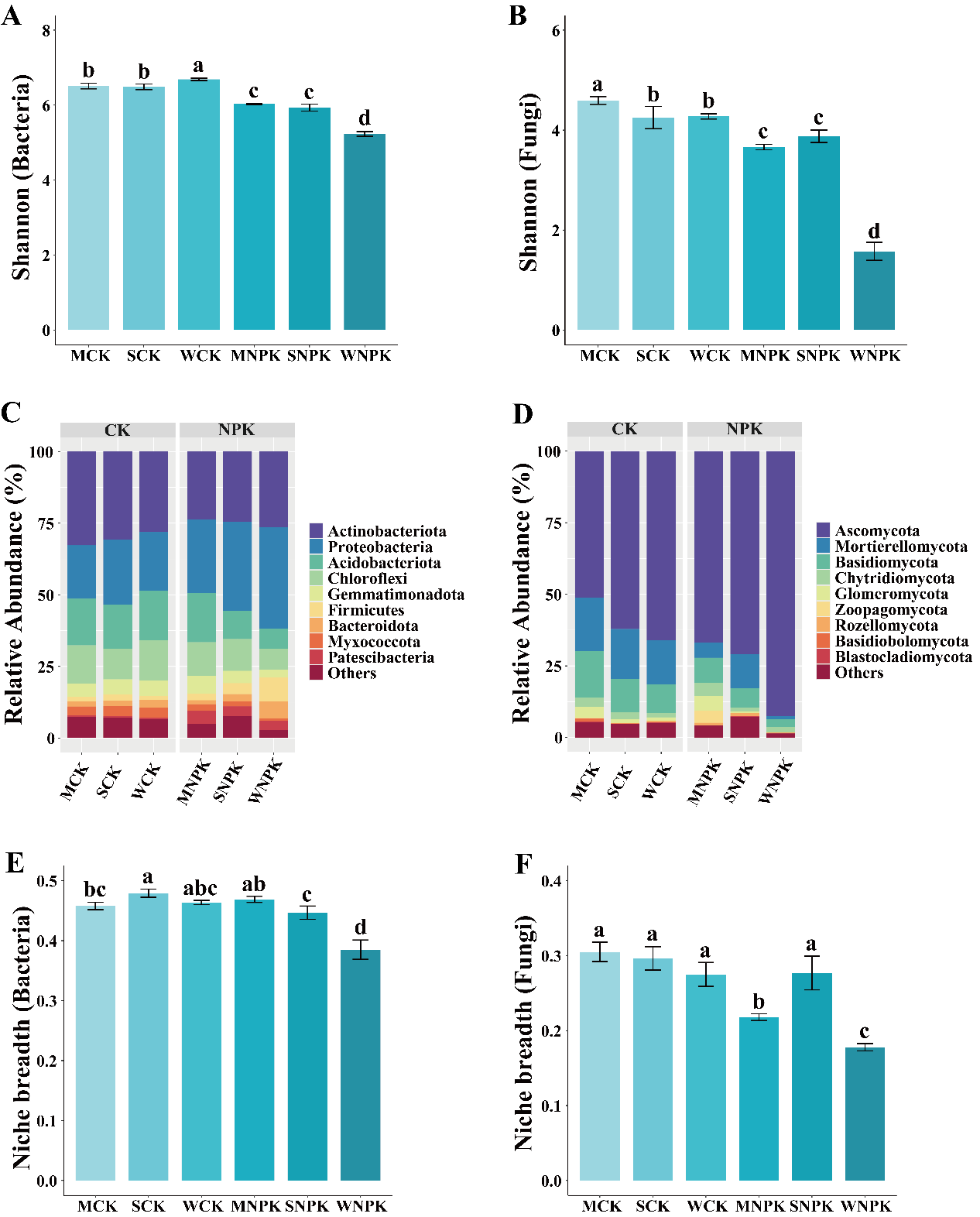 图1 化肥施用对土壤微生物群落组成和生态位宽度的影响