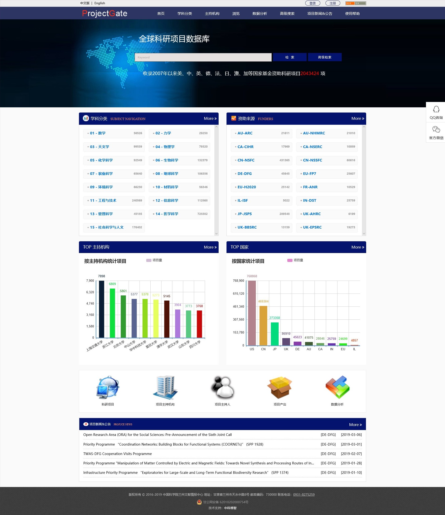 “全球科研项目数据库(ProjectGate)”于2017年由中国科学院兰州文献情报中心建设完成。科研项目信息可以完整清晰地反映一个国家的科技部署、科研实力以及研究重点的变化、科技创新的轨迹,为科研用户项目申报、分析本领域研究热点、研究选题、寻找合作机构和合作者等提供重要的信息支持。全球科研项目数据库的建设为科研人员集成方便的发现全球主要发达国家科研项目信息提供了重要的信息保障。