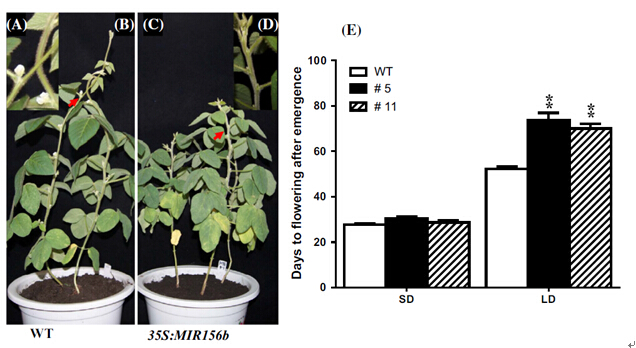 中科院大豆分子设计育种重点实验室在microRNA172/GmTOE4a途径(Plant Mol Biol,2015)之后,又发现了miR156/GmSPL途径,在大豆光周期开花方面取得了重要研究进展。