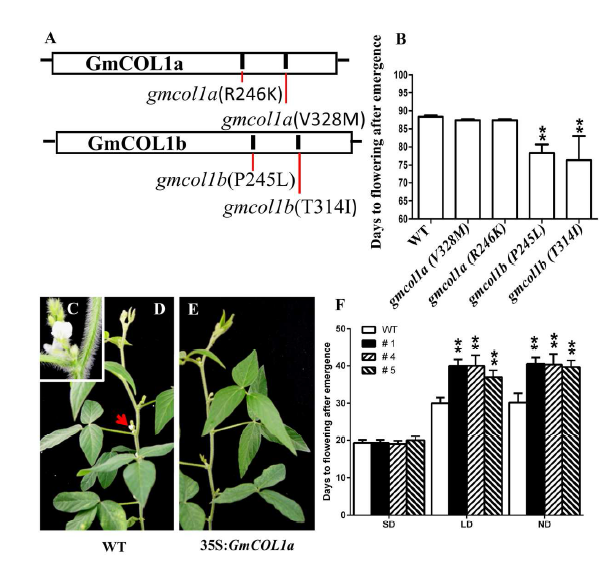 CONSTANS (CO) 在很多植物的光周期反应机制中具有重要的角色。但是,目前尚未有关于CO在大豆开花期调控途径的功能研究。为了填补这项空白,我们课题组克隆了大豆中的与拟南芥CO基因同源的两个基因—GmCOL1a和GmCOL1b,并研究长日照条件下,GmCOL1a和GmCOL1b对大豆光周期的影响。课题组的前期研究结果表明,长日照条件下,大豆开花期主要受E1、E2、E3和E4的影响。本研究进一步明确了这四个基因的调控关系,即在转录水平上,E3和E4促进E1和E2的表达,E1抑制E2的表达,并且明确这四个基因对GmCOL1a和GmCOL1b的表达起到促进作用。GmCOL1a的过表达会延迟大豆的开花期,GmCOL1b突变后,开花期提前,即在长日照条件下,GmCOL1a和GmCOL1b抑制大豆的开花期。其中,GmCOL1a通过抑制GmFT2a/5a的表达而抑制大豆的开花期。此外,我们研究还表明,GmCOL1a抑制E1和E2的表达,反之亦然。因此,我们认为,E1、E2和GmCOL1a形成负反馈调节环。综上,GmCOL1a和GmCOL1b在长日照条件下,抑制大豆的开花期,进一步完善了大豆光周期的调控网络。