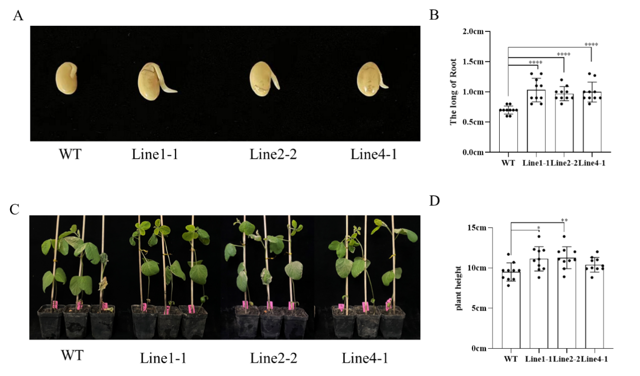 东北地理所农田有害生物控制学科组孟凡立研究团队将来自于花生ALDH家族的AhALDH2B6基因成功转入大豆受体中,发现在大豆基因组中过表达AhALDH2B6可以显著增加转基因大豆的耐低温能力(图1);在生化方面,转基因大豆表现出丙二醛(MDA)活性降低、过氧化物酶(POD)和过氧化氢酶(CAT)含量增加的特点,这表明转基因大豆具有更强的低温耐受性。通过转录组分析发现,AhALDH2B6基因参与调控苯丙烷代谢与合成相关途径,影响植物发育,减少了低温胁迫对转基因大豆植株的损伤。该研究在大豆中成功实现了花生AhALDH2B6基因的表达,获得了耐低温的转基因大豆材料,明确了过表达该基因提高大豆耐低温能力的机理,为大豆耐低温育种提供了理论依据和新思路。