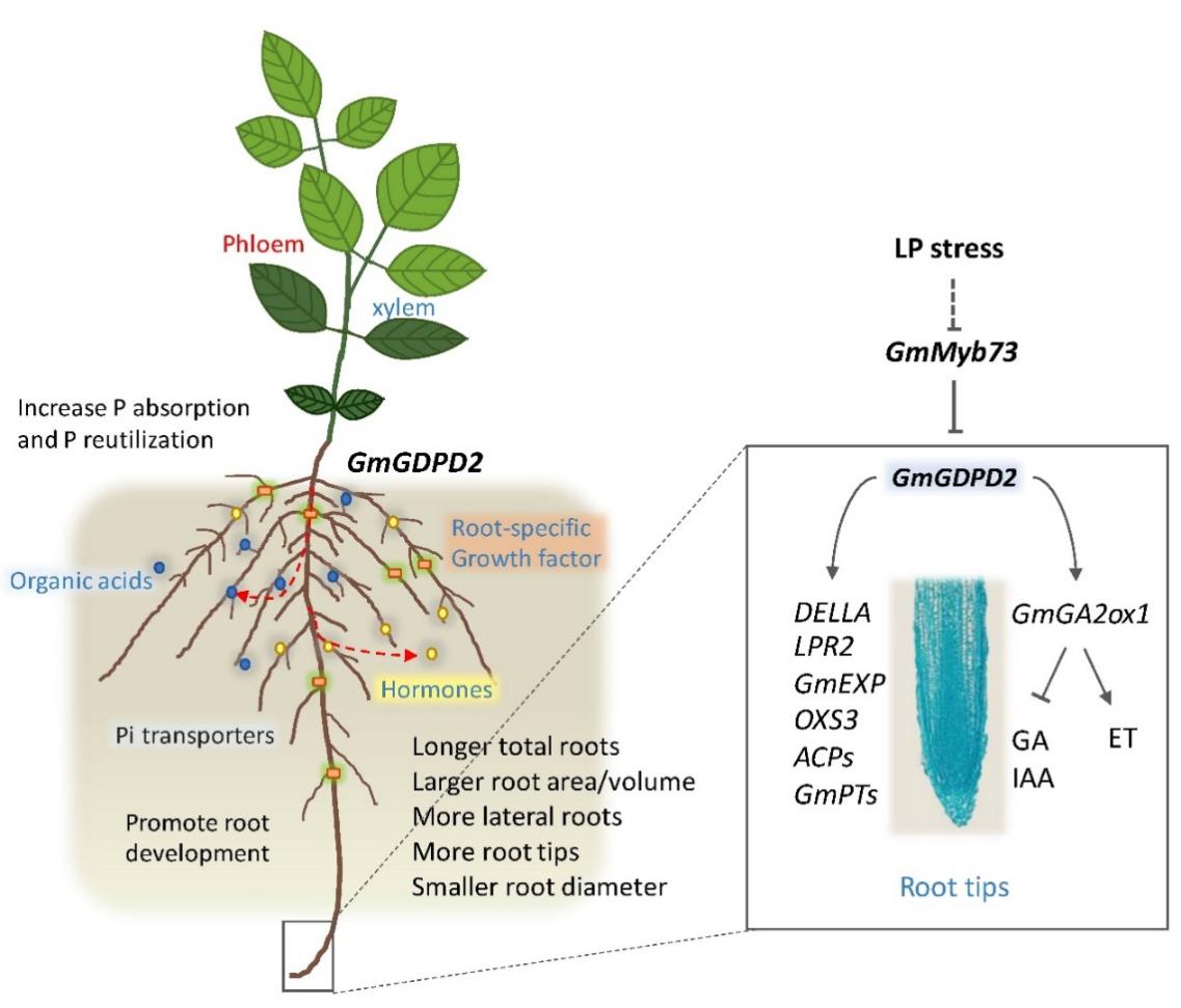 该研究鉴定了一个新的植物磷效率调控模块,阐明了以GmGDPD2为中心的分子模块是如何调控大豆根系发育和低磷耐受力。GmMyb73感知磷饥饿后表达下调,促进GmGDPD2的表达,并通过GmGA2ox1活性影响GA、生长素与乙烯等激素水平抑制主根伸长,诱导侧根和根毛形成,从而影响磷的吸收与利用。因此,以GmGDPD2为中心的磷效率调控模块代表了一个很有潜力的核心枢纽,可以通过重塑根系结构特性来提高大豆对低磷胁迫的耐受性并最终提高产量,为未来通过协同改良多个性状实现大豆产量潜力突破、减少磷肥施用提供了新思路。