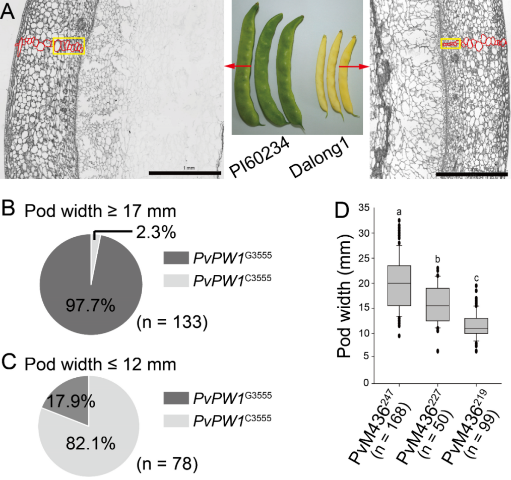 东北地理所研究团队以窄豆荚表型的菜豆品种大龙1号(豆荚宽度12 mm)为母本、宽豆荚表型的菜豆品种PI60234(豆荚宽度21 mm)为父本(图A),通过传统的图位克隆技术,完成了PvPW1基因的精细定位,进一步利用17组双亲遗传群体对PvPW1基因调控豆荚宽度的功能进行验证。研究发现,133个宽豆荚菜豆品系中97.7%为PvPW1G3555单倍型(图B),78个窄豆荚品系中82.1%为PvPW1C3555单倍型(图C),说明PvPW1G3555单倍型正调控菜豆豆荚宽度,且PvPW1基因已在菜豆的人工选择育种中受到选择。59个菜豆品种的重测序结果显示PvPW1基因内含子中8-bp的插入与PvPW1G3555单倍型相关联。基于此,该研究开发了可用于分子辅助育种的InDel分子标记PvM436。对317个菜豆品系进行基因分型的结果显示,PvM436247和PvM436227基因型个体的豆荚宽度大于PvM436219基因型个体(图D)。该研究克隆了控制菜豆豆荚宽度的主效基因PvPW1,基于该基因的多态性开发了可用于分子辅助育种的PvM436分子标记,对于利用分子辅助手段进行菜豆豆荚形态的定向改良提供理论基础和实践指导。