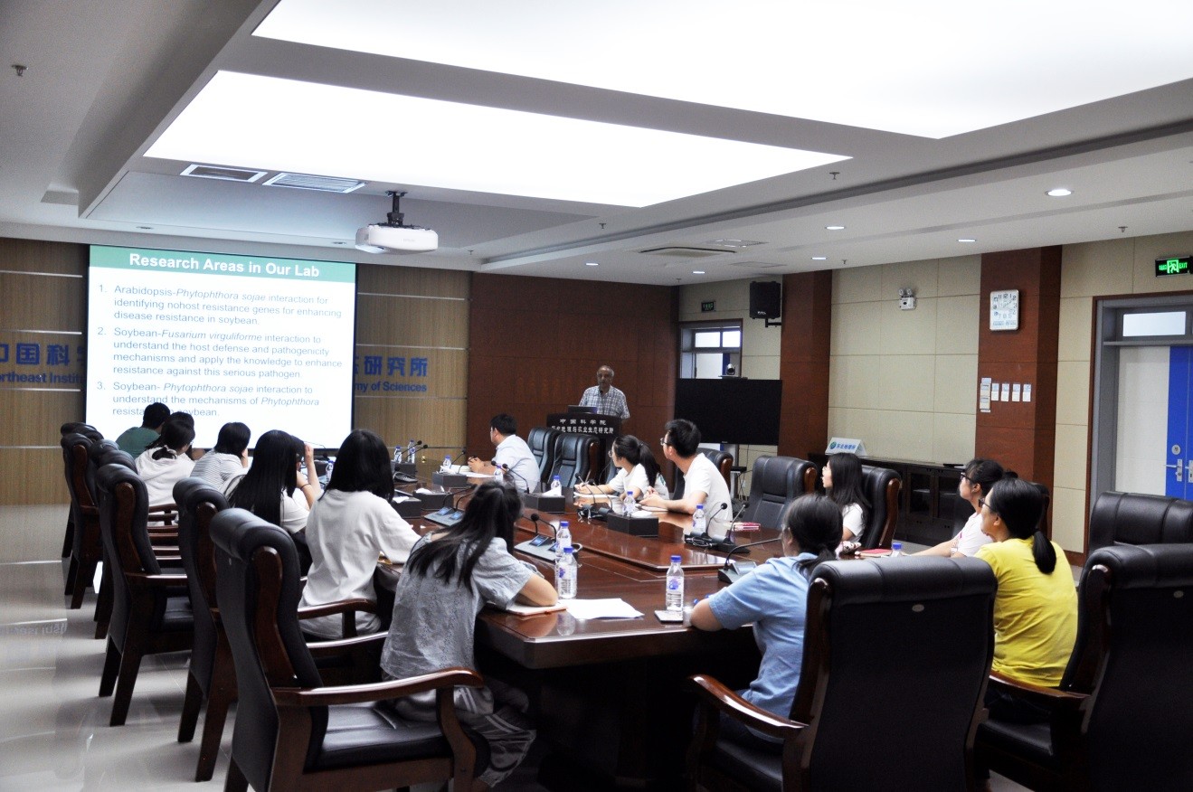 2019年6月20日,应大豆分子设计育种重点实验室邀请,中国科学院国际人才计划“国际访问学者”美国爱荷华州立大学Madan Kumar Bhattacharyya教授来东北地理所进行学术交流,并做了题为“Arabidopsis Nonhost Resistance Genes for Enhancing Disease Resistance in Soybean”的学术报告,研究所相关科研人员和研究生30余人参加了报告会。