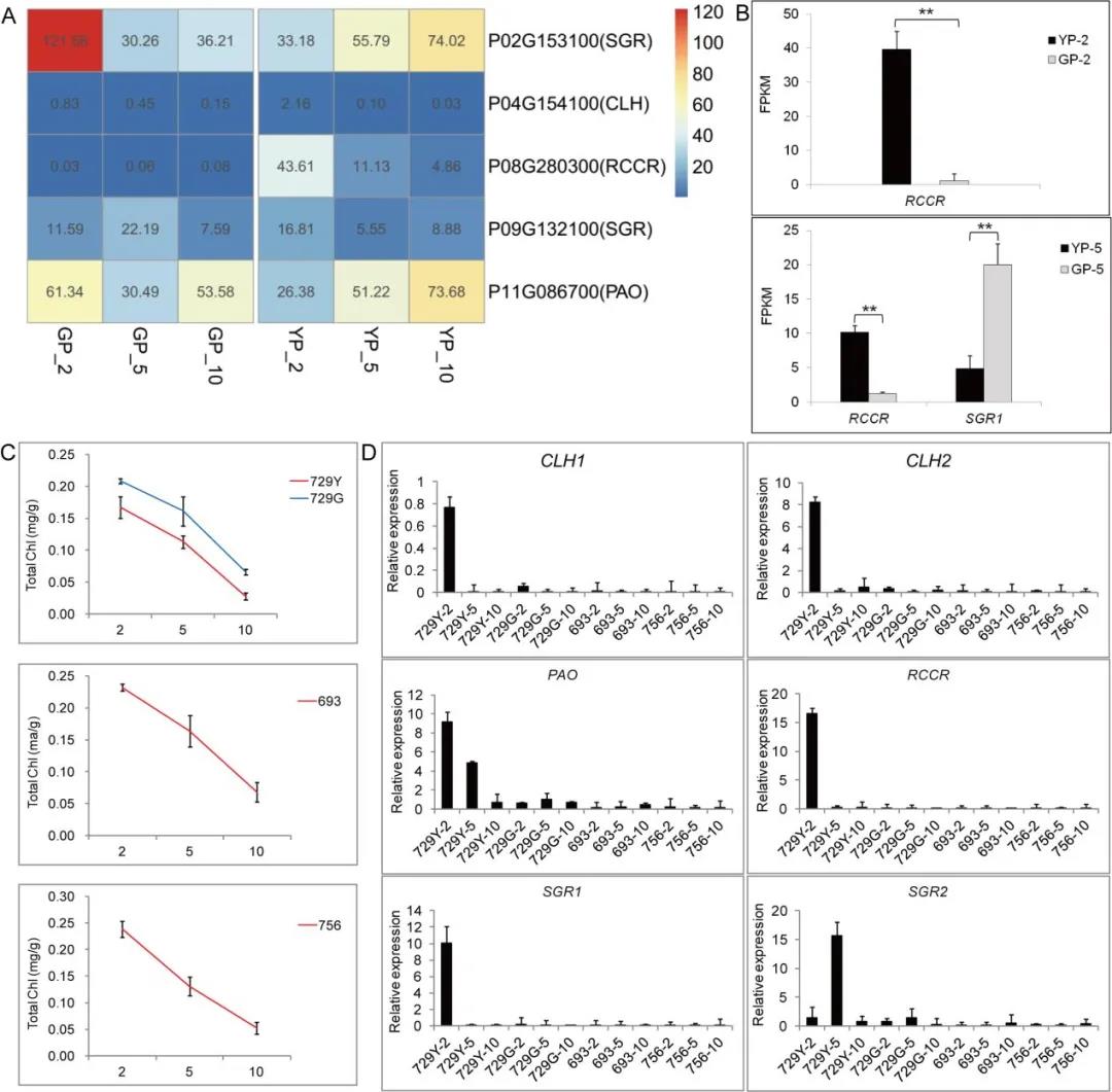 A、B:转录组测序揭示叶绿素降解基因表达变化;C:其他绿荚突变体M693,M756,M729豆荚叶绿素含量变化;D:其他绿荚突变体中叶绿素降解基因表达变化