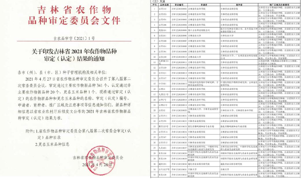 由中科院东北地理与农业生态研究所大豆分子设计育种重点实验室冯献忠研究员团队通过分子设计育种技术选育的大豆新品种“东生118”、 “东生119”和 “东生120”,以及冯献忠团队与吉林市农业科学院合作选育的大豆新品种“九农403”,日前通过吉林省农作物品种审定委员会审定。上述品种是研究团队利用分子设计育种平台通过全基因选择设计育种方案,借助中科大豆育种联合体平台,定向改良提高大豆产量和含油量等重要农艺性状培育而成。