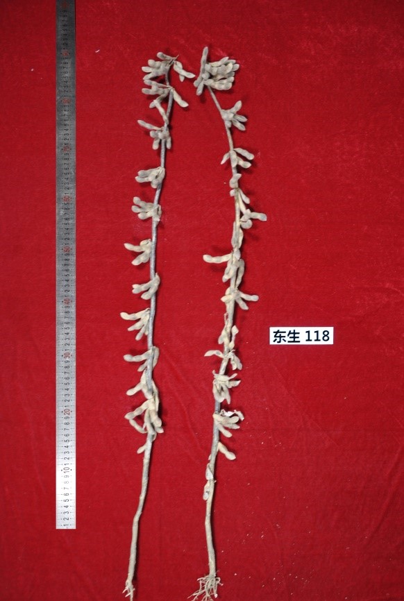 “东生118” (审定编号:吉审豆20210028)为高产、高油大豆新品种。该品种以吉育79为父本,黑河43为母本。2019-2020年区域试验平均公顷产量2977.4公斤,比对照吉育86增产7.1%;2020年生产试验平均公顷产量2980.1公斤,比对照吉育86增产4.6%。“东生118”品种亚有限结荚习性,平均株高93.5厘米,主茎型结荚,主茎节数16.9个,以三粒荚为主,荚熟时呈深褐色。圆叶、白花、灰毛,籽粒圆形,种皮黄色,无光,种脐黄色,平均百粒重22.6克。人工接种鉴定,高抗大豆花叶病毒1号株系,抗大豆花叶病毒3号株系。两年平均籽粒粗蛋白质含量38.53%,粗脂肪含量22.59%。