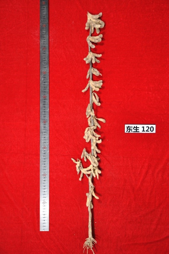 “东生120” (审定编号:吉审豆20210032)为高产、高油大豆新品种。该品种以吉大豆2号为父本,黑农48号为母本。2019-2020年区域试验平均公顷产量2975.8公斤,比对照品种吉育86增产7.1%;2020年生产试验平均公顷产量2947.3公斤,比对照吉育86增产3.8%。2019-2020年区域试验平均公顷产量2975.8公斤,比对照品种吉育86增产7.1%;2020年生产试验平均公顷产量2947.3公斤,比对照吉育86增产3.8%。亚有限结荚习性,平均株高88.9厘米,主茎型结荚,主茎节数16.4个,以三粒荚为主,荚熟时呈深褐色。圆叶、白花、灰毛,籽粒圆形,种皮黄色,有光泽,种脐黄色,平均百粒重18.5克。人工接种鉴定,高抗大豆花叶病毒1号株系,高抗大豆花叶病毒3号株系。两年平均籽粒粗蛋白质含量37.78%,粗脂肪含量22.10%。