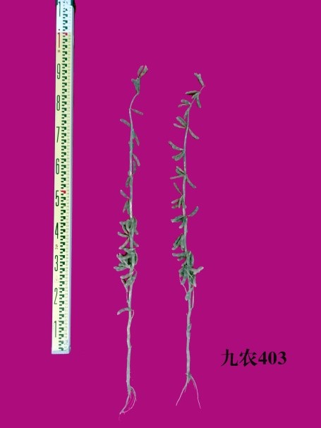 “九农403” (审定编号:吉审豆20210027)为高产大豆新品种。该品种以合丰51为父本,九农33为母本。2019年区域试验平均公顷产量3137.40公斤,比对照吉育86增产15.04%;2020年区域试验平均公顷产量3194.82公斤,比对照吉育86增产13.20%,二年区域试验平均公顷产量3166.11公斤,比对照吉育86增产14.12%;2020年生产试验平均公顷产量3171.79公斤,比对照吉育86增产12.18%。亚有限结荚习性,平均株高81.7厘米,主茎节数17.8个,有效分枝2.2个,三粒荚多,荚熟时呈褐色。尖叶、紫花、灰毛,籽粒圆形,种皮黄色,有光泽,种脐黄色,平均百粒重20.0克。人工接种鉴定,高抗大豆花叶病毒1号株系,高抗大豆花叶病毒3号株系。籽粒粗蛋白质含量38.81%,粗脂肪含量21.26%。