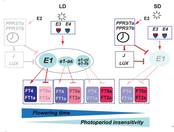 1920年研究者发现了大豆等植物可度量日照长度调节开花的现象即著名的植物光周期现象。随后,控制大豆开花遗传因子被相继发现,主要基因位点于上个世纪七十年代被定名。在大豆光周期发现百年华诞之际,我们回溯了E1、E2与E3等主要生育期基因的克隆历程(图1)。通过经典的图位克隆方法,于2009年成功地克隆了E3基因 (Watanabe et al., 2009); 2011年克隆了E2基因 (Watanabe et al., 2011),于2012年成功地克隆了E1基因(Xia et al., 2012)(图2)。特别是E1基因的成功克隆,为大豆光周期发现以来的重要突破,展示了大豆具有与其他植物在光周期反应上不同的特异性调控机制,为进一步精细解析大豆光周期反应的分子调控机理奠定了重要的基础。自成功克隆E1基因以来,研究者相继也成功地克隆了了与生物钟相关的PRR3a、LUX及J 等重要生育期调控因子,丰富了已明确的E1-FTs通路(图3)。为此,进一步鉴定调控生育期的新基因与进一步研究生育期基因间精细调控网络有助于人们最终破解大豆光周期反应的分子本质及明晰大豆适应不同纬度的精细分子机制。