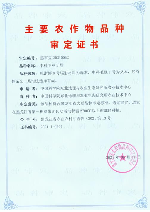 6月11日,由中国科学院东北地理与农业生态研究所张秋英研究员研究团队选育的鲜食大豆品种“中科毛豆5号”(审定编号:黑审豆20210052)顺利通过黑龙江省农作物品种审定。