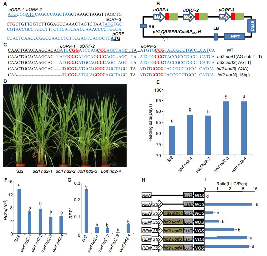 为了利用基因编辑手段提高靶基因的表达量,该团队拟对基因的上游开放阅读框架(open reading frames, uORFs)进行编辑。研究表明,uORFs可以抑制开放阅读框架(primary ORFs, pORFs)的翻译,通过编辑和突变这些uORFs可以达到提高pORFs的蛋白水平的目的。本实验室前期研究发现Hd2是控制东北水稻开花最重要的抑制子之一,序列分析发现Hd2在5'UTR区域存在3个uORF,因此,该研究团队针对3个uORF分别设计3个靶位点进行基因编辑,获得了多种不同编辑类型,抽穗期统计结果显示,突变体出现不同程度晚花(4.6天-11.2天),其中第一个uORF突变的晚花效果最明显。突变体中,抽穗期基因Ehd1、Hd3a和RFT1的表达量都低于野生型,与其晚花表型一致。进一步将Hd2 uORF与4种突变类型uorf插入到35S启动子与LUC报告基因之间,瞬时转化原生质体,发现Hd2 uORF的突变与否并不影响报告基因LUC的转录水平,但是Hd2 uORF的插入显著降低了LUC的荧光信号,而uorf的突变可以不同程度的恢复LUC的蛋白量,证实了Hd2 uORF的突变可以通过提高Hd2 pORF的翻译达到增强Hd2功能的效果,从而实现不同程度延迟开花的目的,这表明对于Hd2 uORF的编辑突变可以作为未来微效改变水稻开花性状的有效靶点。