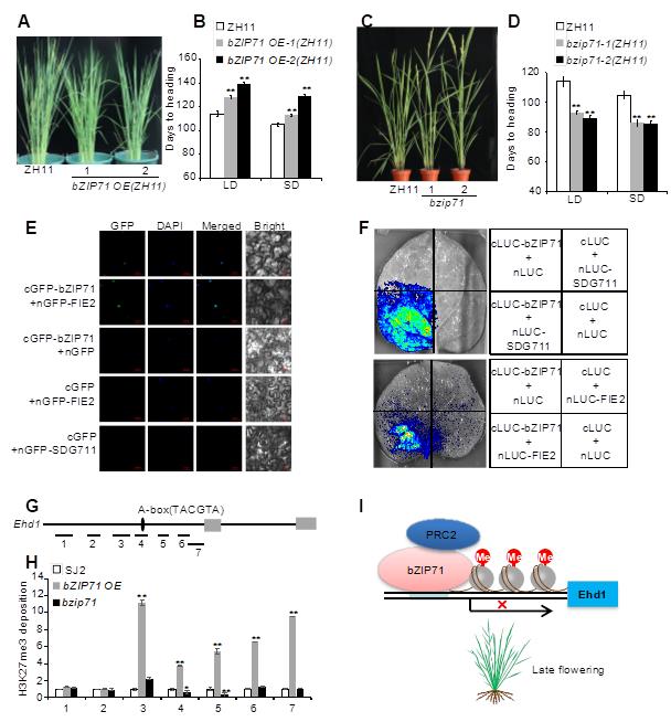 该项研究揭示了bZIP71调控水稻抽穗期的新机制,其功能发挥不依赖于Hd2、Hd4和Hd5,而是通过与多梳抑制复合体2(PRC2)的两个成员SDG711和FIE2的互作,调控Ehd1的H3K27me3水平。