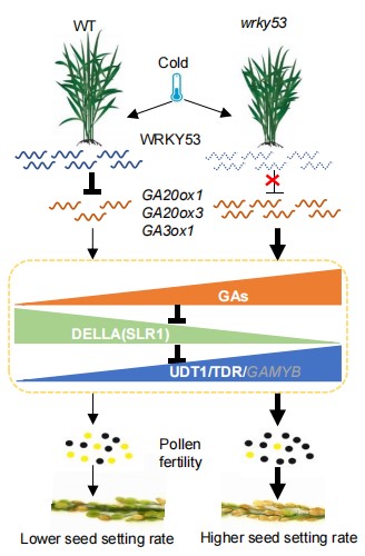 该研究揭示了OsWRKY53转录抑制GA生物合成基因来调控花药中GA含量,从而负调控水稻孕穗期耐冷性;GA通过解除OsSLR1对OsUDT1/OsTDR的抑制,来调控水稻育性;不同优良品种背景下oswrky53水稻材料孕穗期耐冷性显著提高,且低温胁迫条件下oswrky53突变体植株产量显著高于对照。该研究为水稻孕穗期耐冷分子育种提供有价值的位点。