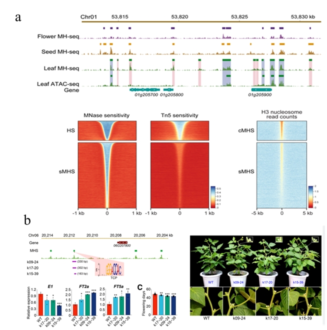 东北地理所农田有害生物控制学科组孟凡立研究团队与美国密歇根州立大学(Michigan State University)Jiming Jiang研究团队合作,利用MH-seq (MNase-hypersensitivity sequencing )技术在全基因组范围内绘制大豆叶片、花和籽粒的MNase超敏感位点(MHS)图谱。发现相较于ATAC-seq (Assay for transposase-accessible chromatin with high-throughput sequencing ),在大豆基因组中MH-seq可定位更多染色质可及性区域(ACR)(图1a)。为了验证MHS调控基因转录的功能,作者通过基因组编辑技术获得了大豆E1等基因侧翼MHS敲除突变体,发现MHS具有增强子功能,在大豆开花和籽粒发育中起着重要作用(图1b)。进一步的研究揭示组织特异性MHS序列通过富集组织特异表达TF结合位点来调控靶基因组织特异表达。