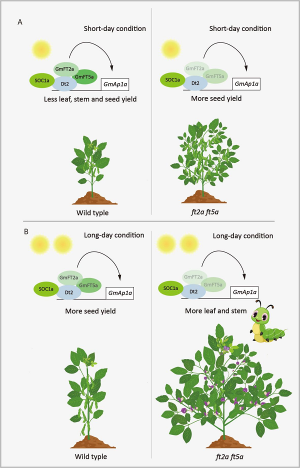 本研究通过编辑大豆中的开花素基因GmFT2a和GmFT5a,成功创制出兼具高产籽粒和高生物量的种质。在短日照条件下,双突变体表现出显著的籽粒产量提升,主茎节数、分枝数和单株荚数显著增加。在长日照条件下,双突变体的总生物量显著提高,表现为营养生长期延长、叶片增大、分枝和节数增加。双突变体的可溶性蛋白和可溶性糖含量保持不变,而苯丙氨酸含量增加、单宁含量降低,可作为优质茎叶饲料。研究进一步揭示了GmFT2a和GmFT5a调控大豆株型的分子机制。GmFT2a和GmFT5a蛋白不仅相互结合,还与大豆分枝和结荚习性关键基因Dt2和SOC1a相互作用,形成复合物,强烈激活下游基因GmAp1s的表达,从而影响大豆的株型发育。该研究为培育适应不同生产需求的大豆品种提供了理论依据和技术支撑,有助于提高大豆的市场竞争力和经济价值。