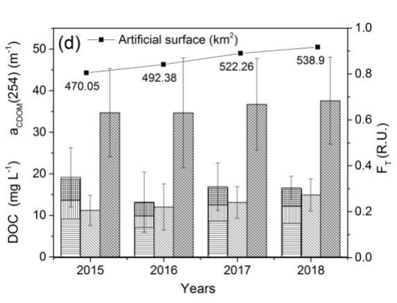 由于DOM的组分复杂且难以分离,目前多使用光谱代理参数如某波段的吸收系数aCDOM(440)、光谱斜率S275-295、M值及特征吸收SUVA(254)来表征其浓度,指示其来源、芳香性和分子量大小。近年来,随着三维荧光技术(EEMs)及其谱图识别技术的发展,为识别DOM组分开辟了新思路。先后出现了寻峰法、平行因子法(PARAFAC)、面积积分法(FRI)来识别DOM的组分并确定其来源。因此,中国科学院东北地理与农业生态研究所水环境遥感学科组的科研人员自2015年至2018年长达四年时间,定点监测采集了长春市区内15个城市水体及8个周边非城市水体,共计获取398个实测DOM数据,借助三维荧光及平行因子技术对比分析了城市水体DOM的光学及组分特征,追溯了其来源,同时研究了DOM的年内季节变化及年际变化。研究结果表明,城市水体和非城市水体DOM均受陆源输入影响较大,其中城市水体水质较差多呈现富营养化,且城市水体DOM浓度明显高于非城市水体(11.12 ± 5.36 mg L-1 > 7.46 ± 2.62 mg L-1),其蛋白类组分丰度也明显高于非城市水体(26% > 21.3%)。此外,我们还发现DOM在夏季具有较高浓度由于其强降雨和藻类生长的双重作用,且随着城市建成区面积的扩张DOM浓度也略有升高,这些发现填补了城市范围内水-陆相互作用下的DOM特征及变化研究的空白,也说明城市水体受到人为因素干扰已日趋恶化,在此呼吁广大居民应提高环保意识,守护我们的蓝天绿水,同时本研究也为城市水环境监测和管理提供了技术支撑。