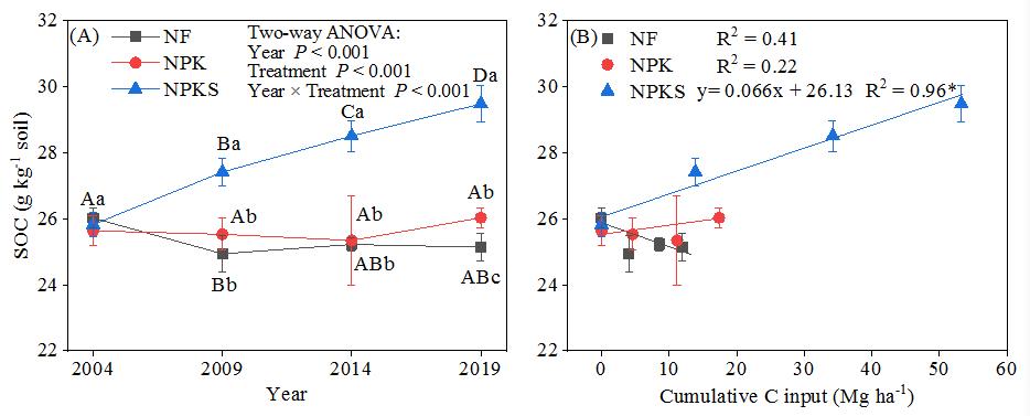 对于高强度利用的农田生态系统,秸秆还田被认为是提升土壤有机碳、改善土壤肥力的有效措施。基于全球数据的Meta分析表明,连续12年的秸秆还田后土壤有机碳将达到饱和状态,因此,要揭示连续秸秆还田条件下土壤有机碳的动态变化规律,需开展长期的田间动态观测。