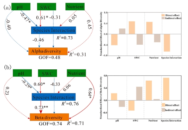 近日,中国科学院东北地理所王国栋研究团队解析了农田、恢复湿地和天然湿地三种土地利用类型中真核生物的alpha 和beta多样性的变化趋势及其驱动机制。研究发现,土壤真核生物的alpha多样性没有显著差异,而土壤真核生物的beta多样性有显著差异,恢复湿地多样性的平均值在自然湿地和农田之间。与恢复湿地和天然湿地相比,农田土壤真核生物群落组成的多样性较低。土壤真核生物群落从农田到天然湿地的共生网络正负边缘比增加,表明恢复过程中物种相互作用增强。结构方程模型表明,物种的正:负相互作用和土壤养分直接影响土壤真核生物的多样性。土壤pH值和土壤含水量通过直接影响物种的相互作用,间接影响土壤真核生物的多样性。研究结果表明,湿地恢复可以改变土壤环境,加强微生物协作能力,增加真核生物的多样性。然而,土壤真核生物结构和多样性要达到湿地水平,可能需要很长时间。