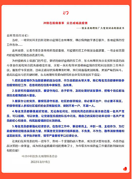 大疫当前,东北地理所党委积极响应上级党组织号召,把党的政治优势、组织优势和密切联系群众的优良作风转化为疫情防控的强大力量。所党委发起《冲锋在前做表率 众志成城战疫情——致东北地理所广大党员同志的倡议书》,号召全体党员要积极参加疫情防控工作,在各项防控工作中做模范、当先锋;把每个岗位都当做抗击疫情的战斗堡垒;在各项工作中,要迎难而上、冲到一线、主动作为,为打赢疫情防控阻击战贡献力量。