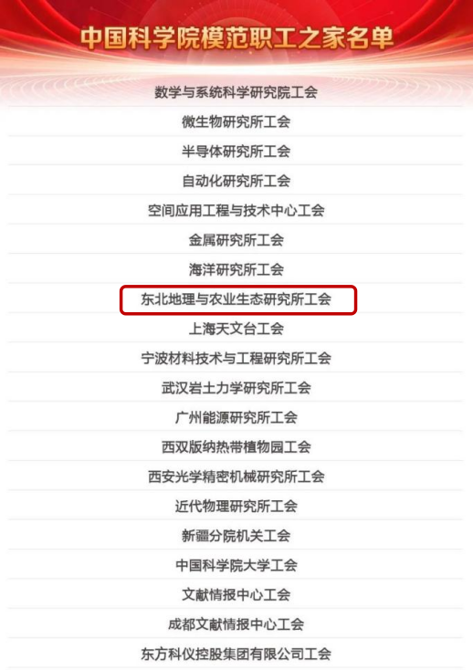 为深入职工之家建设,激发基层工会干部积极性,促进基层工会工作创新发展,中国科学院工会组织开展了中国科学院模范职工之家等评选活动。近日,获得表彰的集体和个人名单公布,全院共20个集体获得“中国科学院模范职工之家”称号,东北地理所工会位列其中,获此殊荣。