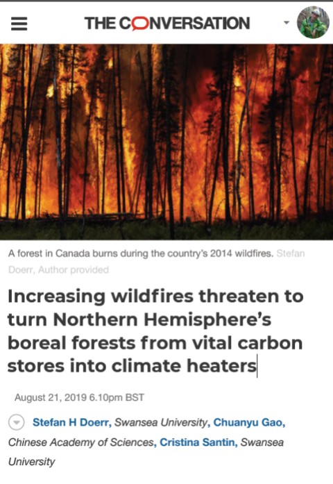 交流期间,双方就野火领域国际前沿问题进行探讨和交流,针对2019年8月21日Nature在线发表的学术论文“Increasing wildfires threaten historic carbon sink of boreal forest soils, Nature, 2019, 572, 520–523”中所阐述的问题进行交流探讨,并共同在公众科普平台“The conversation”上发表实时评论文章“Increasing wildfires threaten to turn Northern Hemisphere’s boreal forests from vital carbon stores into climate heaters”。针对2014年加拿大森林大火对北方森林以及林下泥炭沼泽中土壤碳库的影响向公众进行介绍,并得到Yahoo等国际媒体的转载。