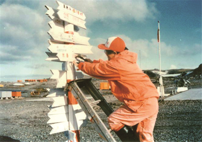 张文芬研究员是吉林省第一个赴南极的科学工作者,她把写有家乡地名的牌子钉在南极长城站的地名标志上