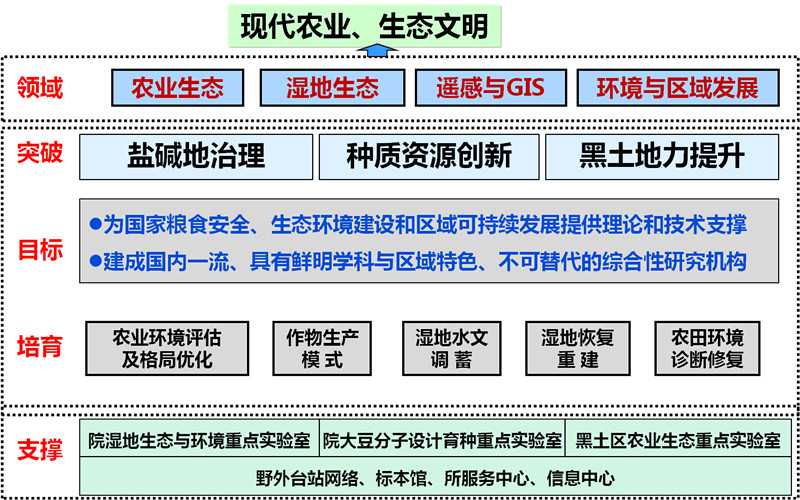重点面向国家农业转型发展及生态文明建设两大服务工程,开展农业生态、湿地生态、作物育种、遥感与GIS、环境与区域发展等学科领域研究,建立农业科学、湿地科学、地理信息科学与区域发展等学科紧密交叉与融合的自主创新体系,为保障国家粮食安全、生态环境建设和区域可持续发展提供理论基础和技术支撑,建成国内一流、具有鲜明学科与区域特色、不可替代的地理学与农业生态学综合性研究机构。