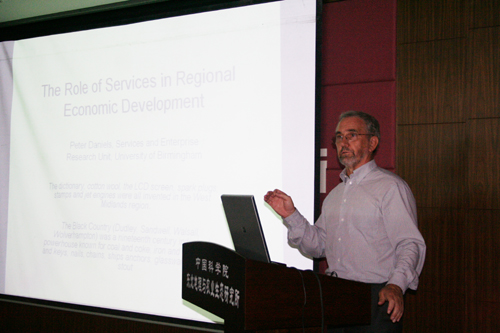 受吉林省外国专家局引智项目资助,英国伯明翰大学地理\地球与环境科学系Peter W Daniels教授于7月20日-26日应邀访问我所进行学术交流与合作。7月22日上午Peter W Daniels教授在我所做了学术交流报告, 题目是“The role of services in regional economic restructuring”,以英国伯明翰和西米德兰地区为例,分析了服务业尤其是生产者服务业的发展特征、空间分布规律和影响因素,对伯明翰和西米德兰地区的服务业发展态势进行了阐述。张平宇研究员,马延吉副研究员等科研人员和研究生与Peter W Daniels教授进行了热烈的讨论与交流。