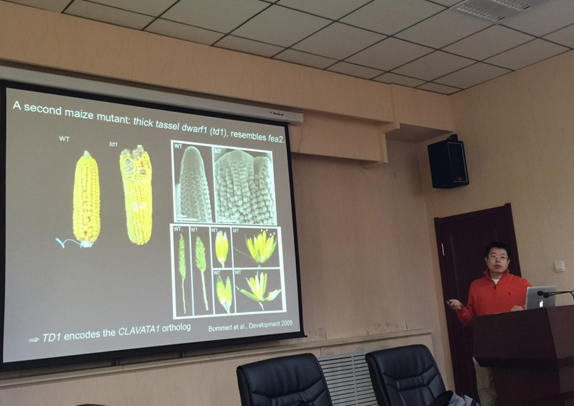 报告会上,吴博士介绍了玉米发育过程中控制穗行数的“G protein”信号途径,从获得的玉米突变体fasciated ear mutant作为研究对象,揭示了控制其性状的G protein的作用机理,吴博士对自己的试验设计及思路的阐述,使在座的科研工作者受益匪浅。