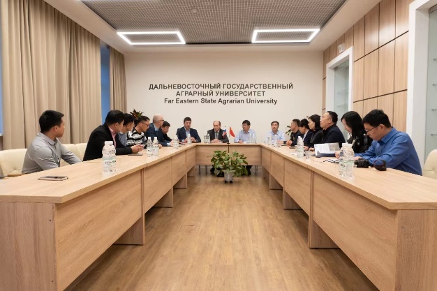 阿穆尔州农业部第一副部长Adamenko Sergey会见了考察团,他强调俄方科研机构与东北地理所在农业生产和湿地保护等方面应开展深入的交流合作。武海涛指出,双方可以在阿穆尔河流域的科研考察、黑土地保护与利用、智慧农业以及加强学术交流和学生联合培养等方面开展合作,在高产大豆品种选育及配套栽培技术方面相互借鉴交流经验,联合培育在俄罗斯远东地区可种植的早熟、优质大豆新品种,共同保障粮食安全和生态安全。