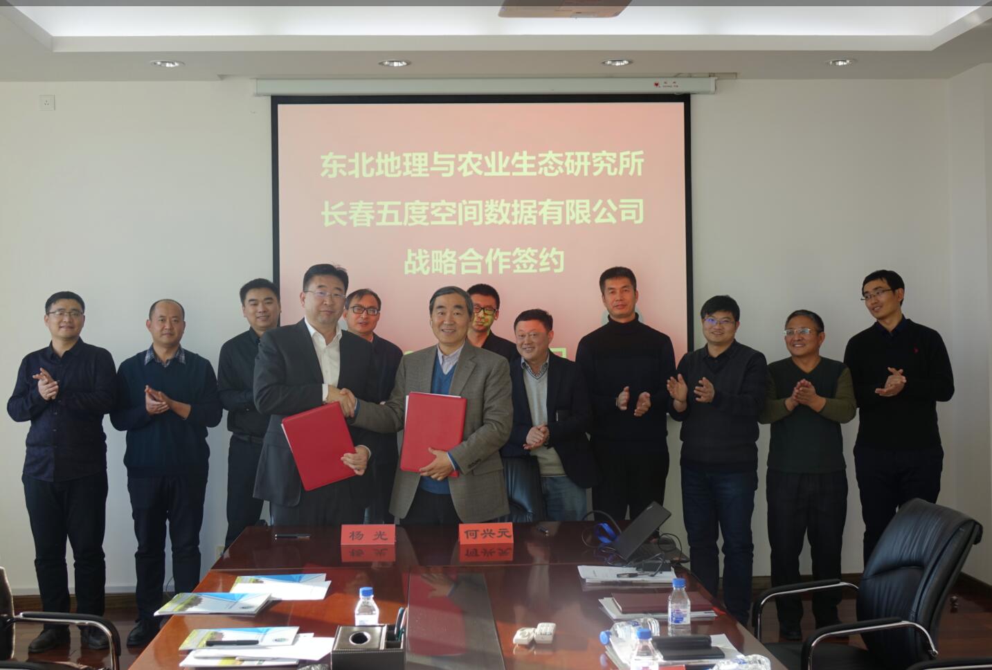 2019年1月9日,东北地理所与长春五度空间数据有限公司签署了战略合作协议。东北地理所所长何兴元、副所长姜明、所长助理王宗明、科研计划处副处长武海涛、院地合作办公室主任刘福涛、遥感与地理信息中心主任宋开山、刘焕军研究员、科研处处长助理王明全,五度空间数据公司董事长杨光、总经理孙岳、总工程师李飞和开发部经理刘忍权参加了签约仪式。