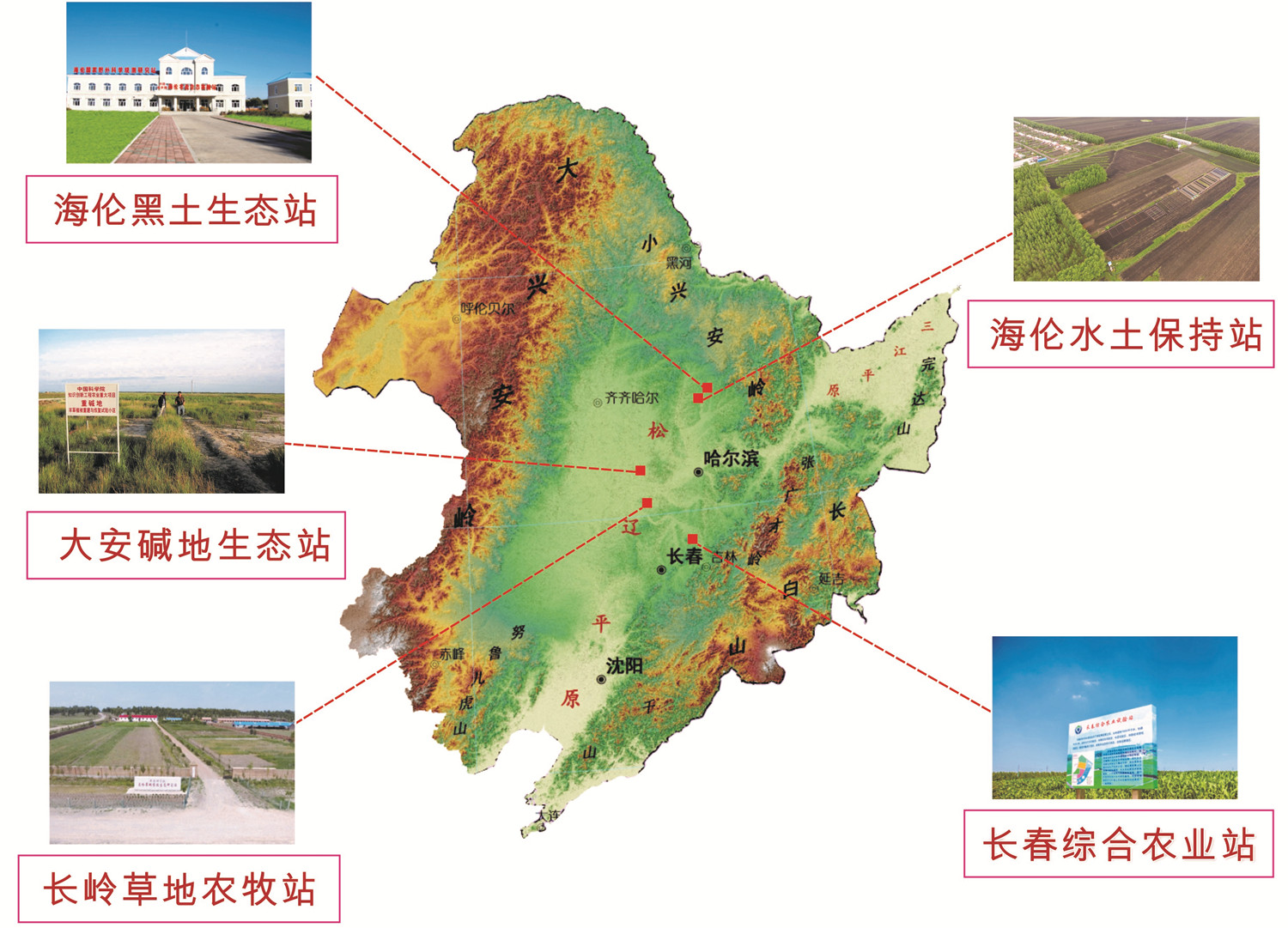 东北地理所构建了以海伦国家生态站为核心的中国科学院东北农业监测网络,包括:中国科学院海伦农业生态实验站(黑龙江海伦农田生态系统国家野外科学观测研究站)、中国科学院大安碱地生态试验站、中国科学院长岭草地农牧生态研究站、中国科学院海伦水土保持监测站、中国科学院长春综合农业试验站,形成了覆盖东北主要粮食产区的农业生态系统野外长期定位观测网络。
