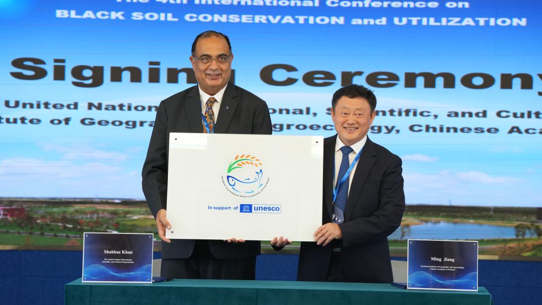 在开幕式上,东北地理所与联合国教科文组织东亚地区办事处签订了合作意向书,与俄罗斯科学院索恰瓦地理研究所签订了合作备忘录。2023年9月,首届UNESCO亚太地区MAB青年论坛提出了筹建“国际生物多样性与粮食安全青年联合会”的动议,在此次国际会议开幕式上,Shahbaz Khan先生将“国际生物多样性与粮食安全青年联合会”的牌匾授予东北地理所,进一步夯实了东北地理所与相关单位的国际交流与合作,为国际青年人才交流提供了重要的平台。