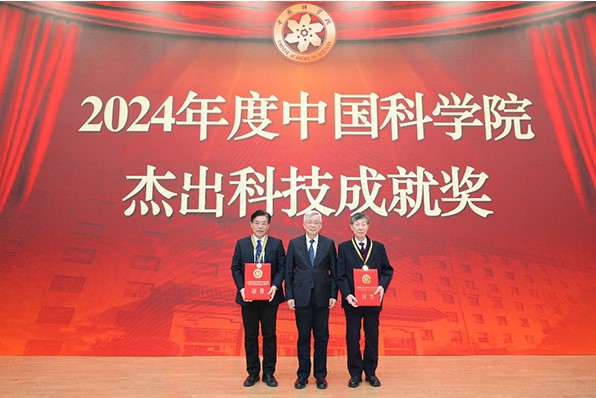 侯建国为获得2024年度中国科学院杰出科技成就奖个人成就奖的陈立泉院士、陈仙辉院士颁奖