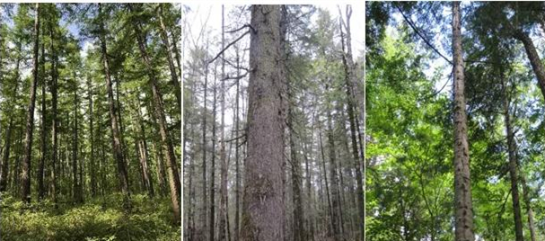 典型森林类型照片(注:2017年7月拍于长白山,从左到右、从上到下依次为长白落叶松、鱼鳞云杉、红松、紫椴和槭树 )