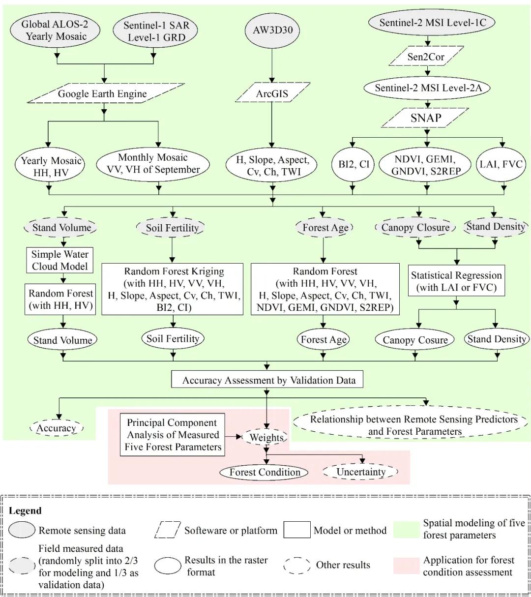 中国科学院东北地理与农业生态研究所地理景观遥感学科组研究人员选取林龄、郁闭度、立木密度、蓄积量和土壤肥力等重要生态参数作为评价指标,基于ALOS-2 L波段雷达数据、Sentinel系列卫星的C波段雷达和可见光影像、ALOS DSM数据和大量的野外调查数据,构建了森林健康遥感评价方法体系,并以长白山国家级自然保护区为例进行了区域森林健康状况评价与制图。