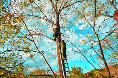在吉林黄泥河国家级自然保护区,巡护员为中华秋沙鸭搭建人工巢。光明图片