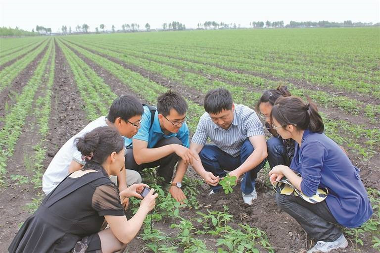 韩晓增(左四)和学生们在查看大豆生长情况。受访者提供。