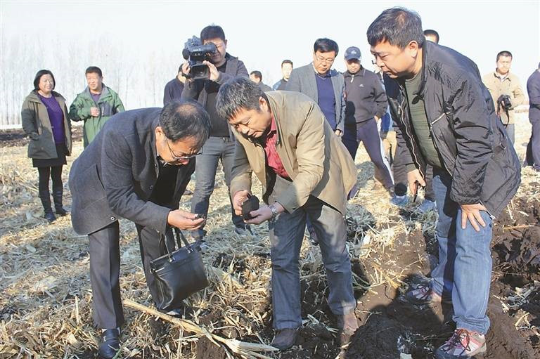 韩晓增(中)介绍黑土地保护利用后土壤结构。受访者提供